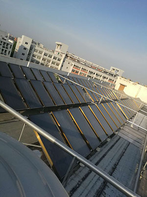 宿舍樓頂為平屋頂時一般把太陽能與空氣源熱泵放置樓頂,采用太陽能與空氣能輔助加熱方式,在光照充足的情況下,不需要空氣源熱泵運行就可以把水加熱,在太陽能不足或陰雨天氣的情況下,使用空氣能進行輔助加熱。兩種能源相結(jié)合,環(huán)保、節(jié)能,全天候、全自動、低能耗、365天運行。